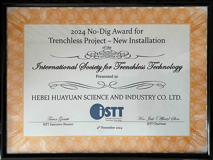 October 2018, Langfang Huayuan Mechanical & Electrical Engineering Co., Ltd. was awarded the 2018 ISTT No-Dig Award (New Installation Award for Hong Kong International Airport) by the International Society for Trenchless Technology (ISTT);