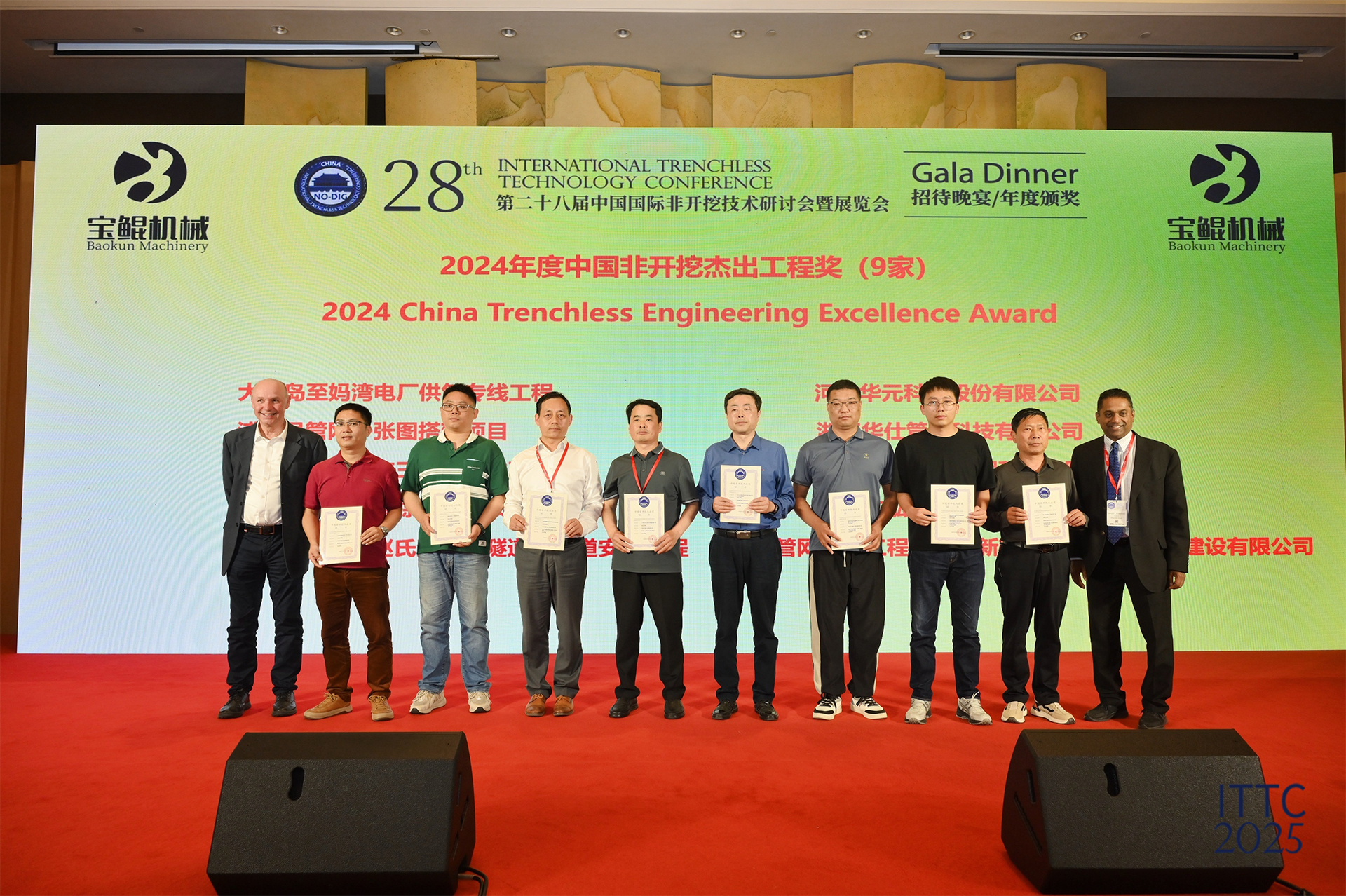在此次盛会的奖项评选环节中,河北华元科工股份有限公司以其完成的《大铲岛至妈湾电厂供气专线工程》荣获2024年度“中国非开挖杰出工程奖”,并凭借《水上定向钻施工平台技术》获得了2024年度“中国非开挖杰出技术奖”。尤为值得一提的是,国际非开挖技术协会(ISTT)主席寿克坚教授首次在国内为华元颁发了2024年度ISTT工程奖(铺设类)。这些荣誉不仅认可了华元的技术创新能力,也极大地激励了华元在未来不断挑战自我、攻克难关的决心。